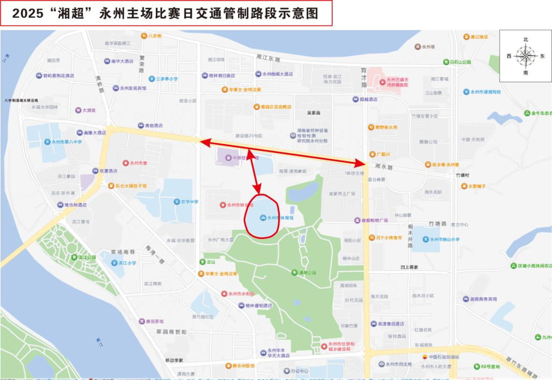 三、管制措施1.停車管制。2025年9月21日17時(shí)30分至23時(shí),永州市體育中心內(nèi)停車場、湘永路與雙洲路口至湘永路與育才路口全路段兩側(cè)人行道及公共停車場,除經(jīng)組委會(huì)批準(zhǔn)的服務(wù)保障賽事工作的特種車輛外,禁止其他所有車輛停放(含非機(jī)動(dòng)車)。2.通行管制。2025年9月21日17時(shí)30分至21時(shí)30分,湘永路與雙洲路口至湘永路與育才路口僅允許公交車通行;21時(shí)30分-23時(shí)全路段禁止所有社會(huì)車輛(含非機(jī)動(dòng)車)通行。四、停車建議1.機(jī)動(dòng)車停放區(qū)域與路段(比賽日當(dāng)天17時(shí)30分-23時(shí)):①湘江西路全路段(除路口、婚紗草坪廣場前后200米范圍內(nèi)及大橋匝道等路段外)。②湘江東路宋家洲紅綠燈路口——瀟湘大橋橋下路段兩側(cè)、翠竹路全路段兩側(cè)、育才路全路段兩側(cè)允許臨時(shí)停放。③河?xùn)|城區(qū)的社會(huì)停車場(除湘永路管制道路內(nèi)的停車場外)免費(fèi)開放。2.摩電車輛停放區(qū)域與路段:除湘永路與雙洲路口——湘永路與育才路口路段兩側(cè)人行道外,其他路段人行道均可停放。