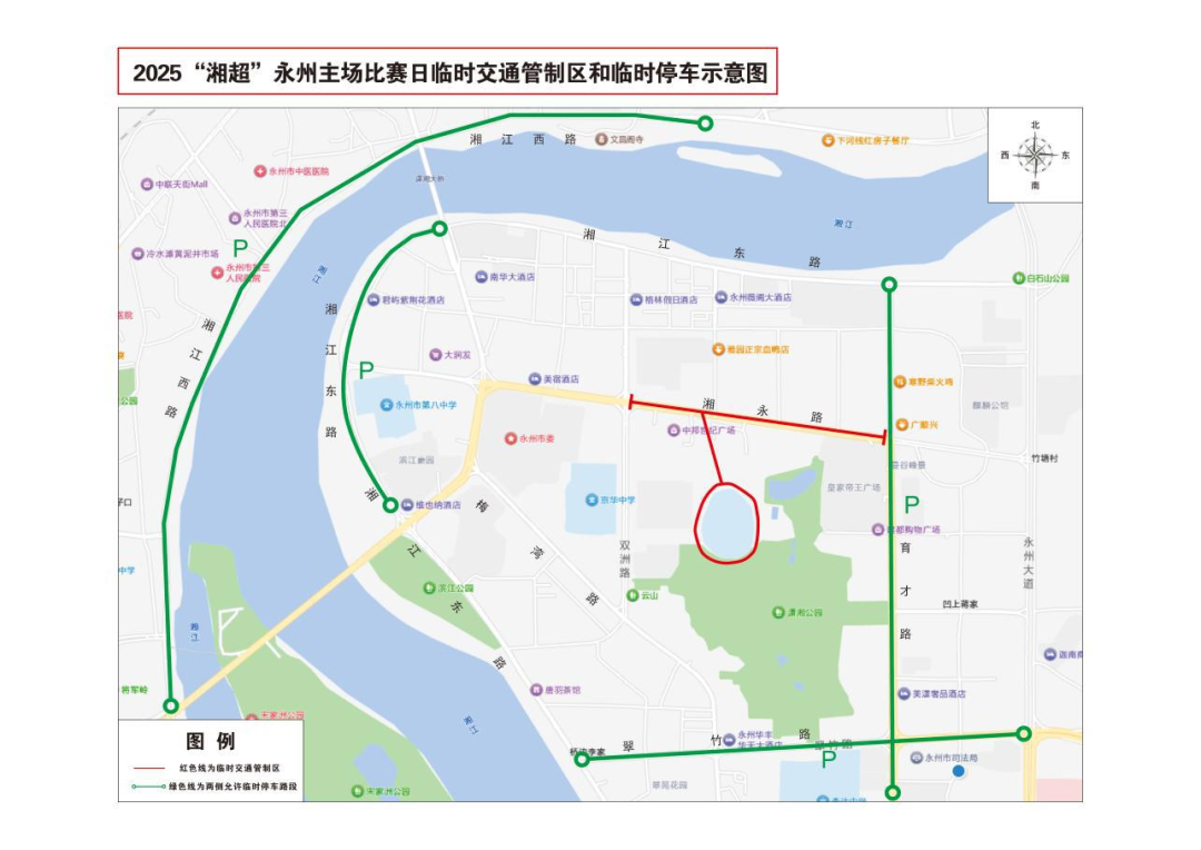 1.停車管制。2025年10月26日9時(shí)00分至23時(shí)00分,永州市體育中心區(qū)域內(nèi)停車場(chǎng)、湘永路與雙洲路口至湘永路與育才路口全路段兩側(cè)人行道及公共停車場(chǎng),除經(jīng)組委會(huì)批準(zhǔn)的服務(wù)保障賽事工作的特種車輛外,禁止其他所有車輛停放(含非機(jī)動(dòng)車)。
