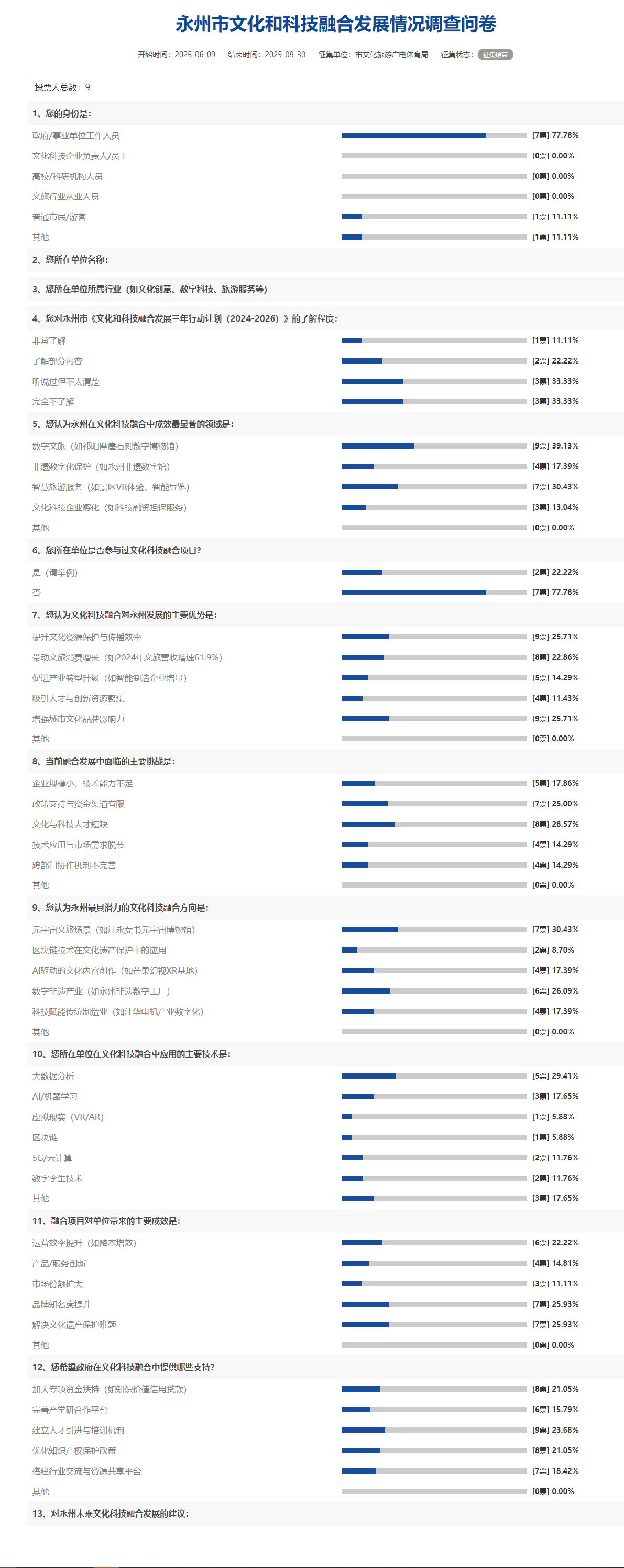 關于永州市文化和科技融合發(fā)展情況的調查問卷自2025年6月9日開始,至2025年9月30日結束,投票人數(shù)9人,具體情況見下圖統(tǒng)計: