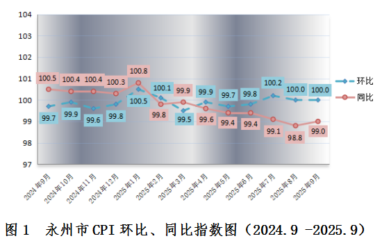 2025年9月份,食品供應總體充足,永州居民消費價格(CPI)同比價格下跌1.0%,環比價格持平。