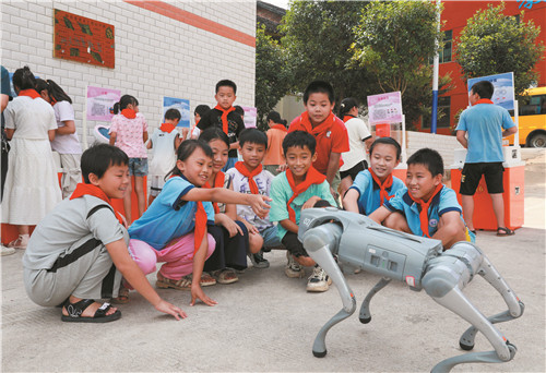 9月10日,新田縣三井學校,學生在與機器狗互動。當天,縣科協邀請市科普大篷車到該縣開展“科普進校園”活動,通過組織學生參觀科普展板、體驗科普儀器等活動,讓孩子們近距離感受科技的魅力,激發他們創新創造意識和科學探索精神。 劉貴雄 攝